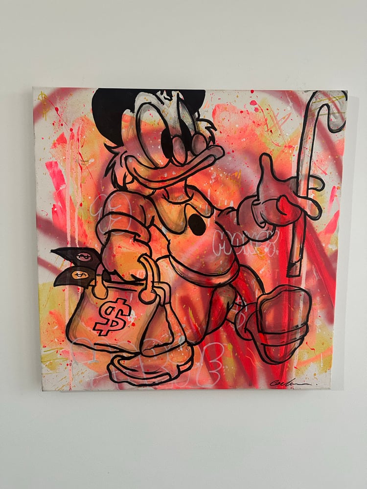A personagem icónica surge em movimento, carregando símbolos diretos de poder e dinheiro, numa composição vibrante marcada por spray, drip e cores intensas.